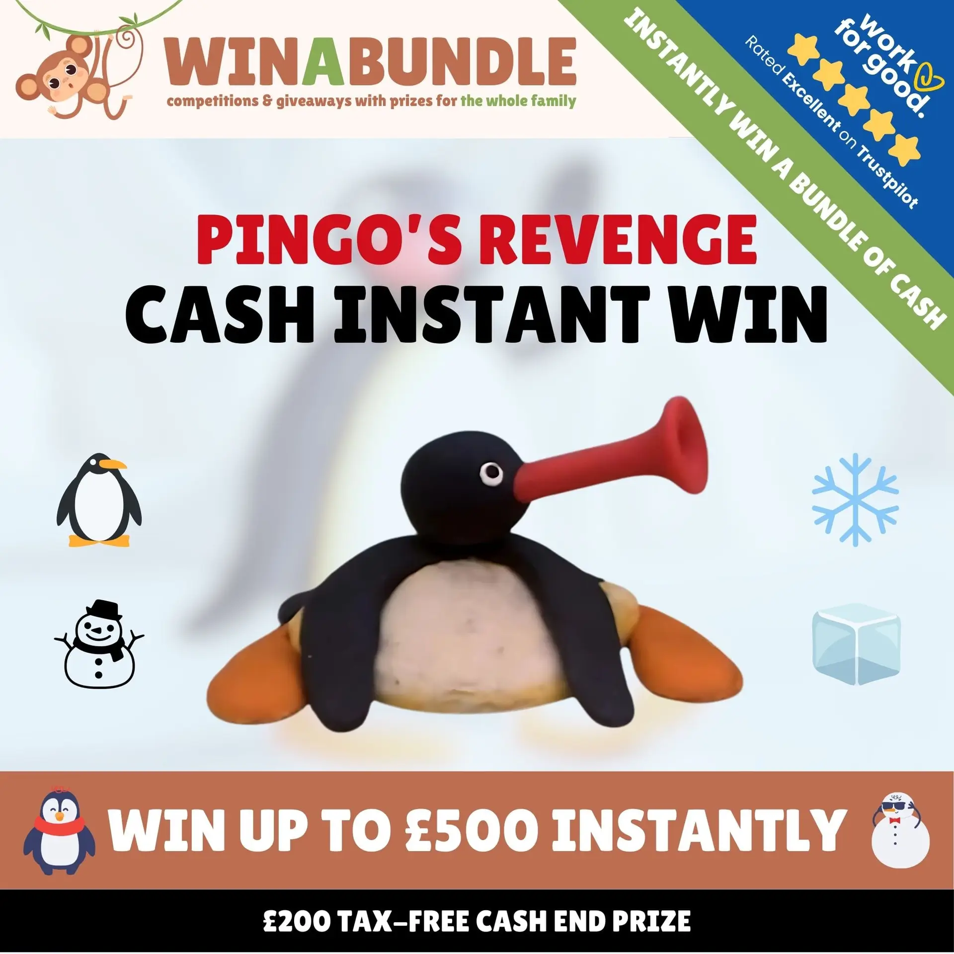 10p of every ticket sold goes to Great Ormond Street Hospital Charity. Pingo is back! Track him down and win up to £500 cash instantly! 💸. Prizes include £500, £300, £250, £200, £100 cash, and site credit ranging from £1 to £20. Every entry also gives you a shot at the £200 bonus prize!