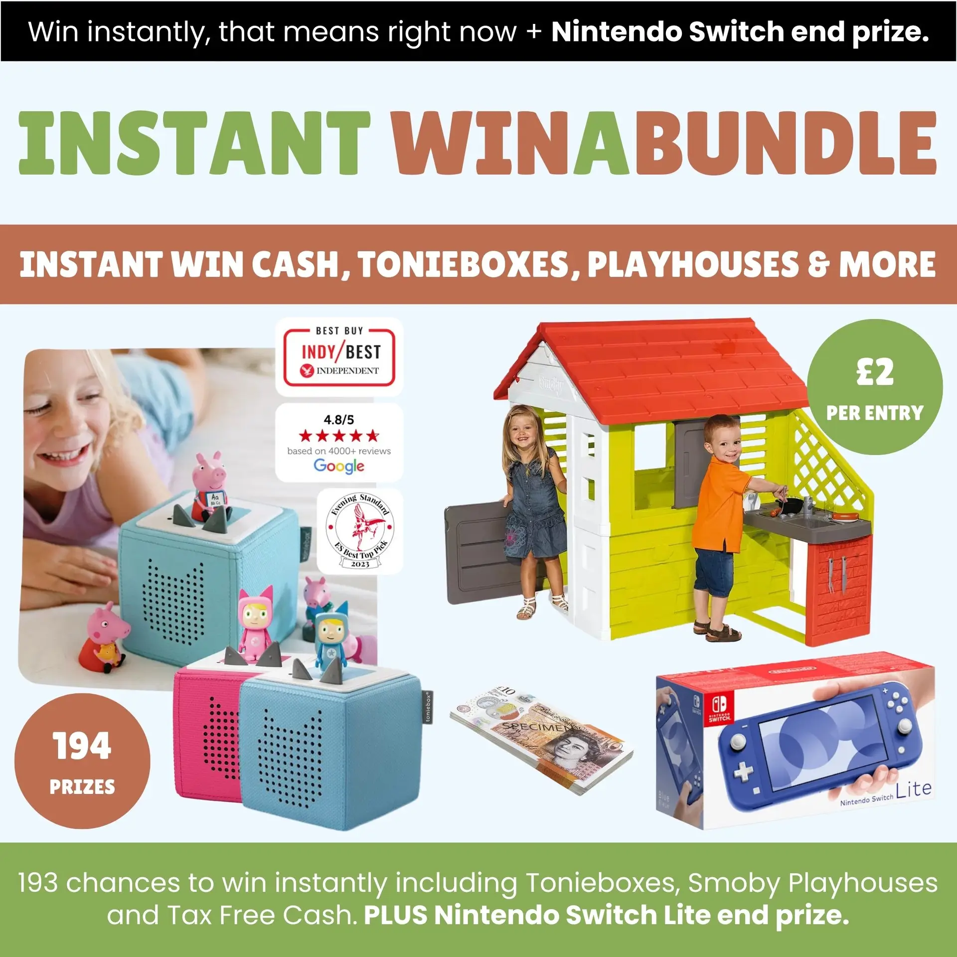 You could be one of our lucky winners, and not only that, but a 10p of every ticket sold will be donated to charity. You could instantly win Tonieboxes, Smoby Playhouses, Tax-Free Cash, Win A Bundle Gift Cards, and if you don’t win instantly you will still be entered into the grand prize of a Nintendo Switch Lite drawn on Sunday 25th August 2024.