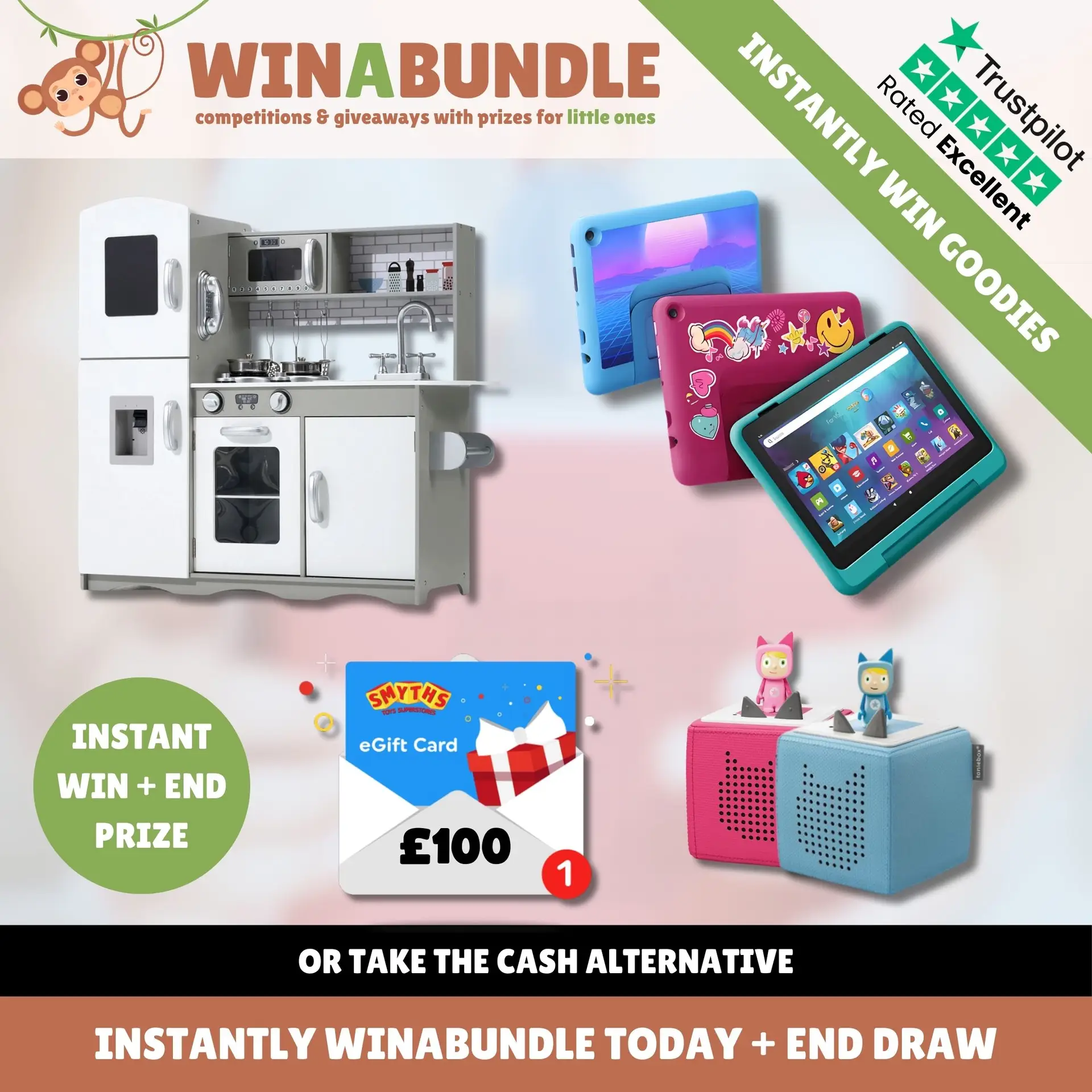 Instantly win one of the following incredible prizes: a Kidoz Play Kitchen (available in 3 colors), a £100 Smyths Gift Card, or a Fire HD 8 Pro Kids Tablet with a 2-year guarantee and parental controls. If you don’t win instantly, you’ll still be entered into the end prize draw for a Complete Toniebox Bundle, which includes a Toniebox, Creative Tonie, 7 Tonies of your choice, headphones, and a carry case.