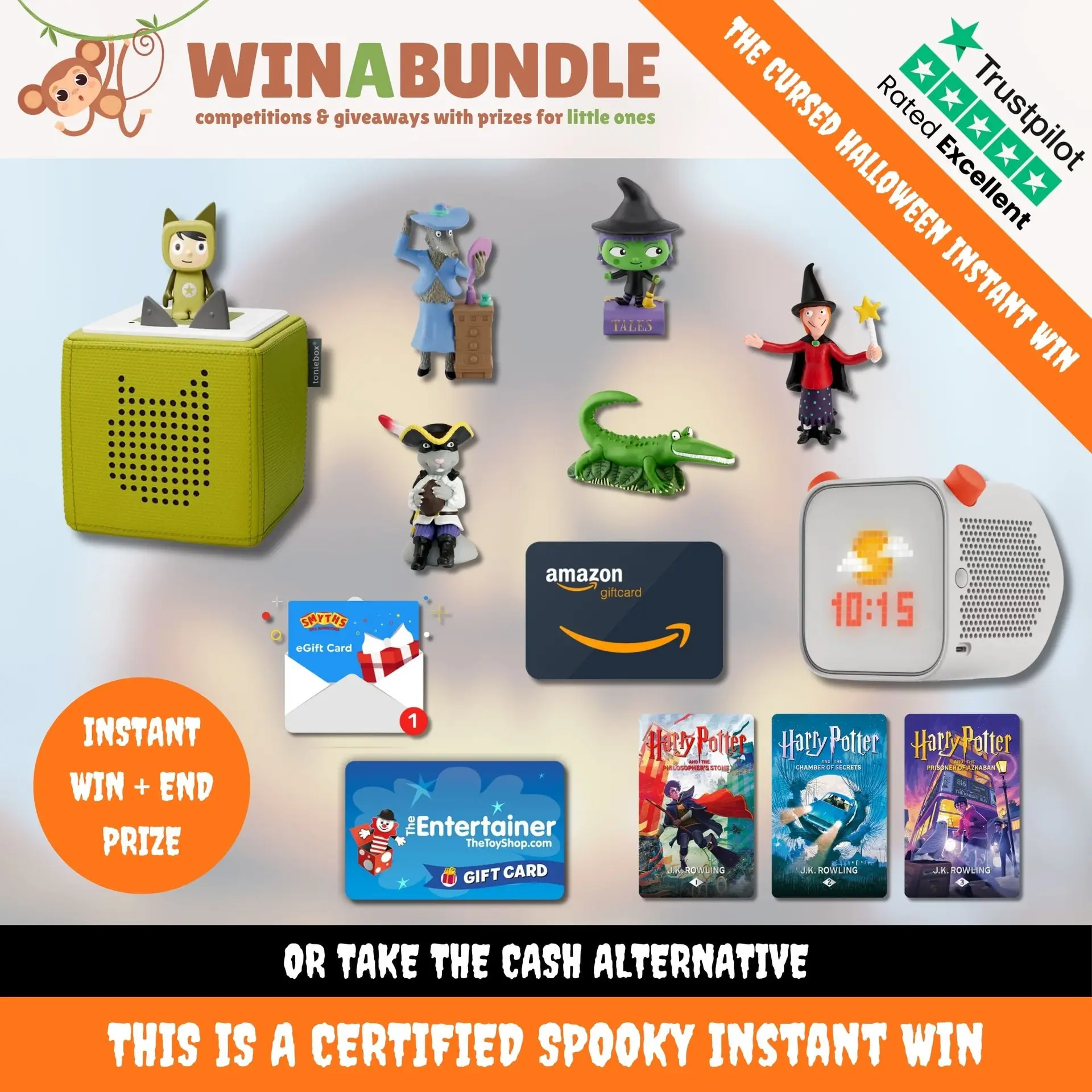 Every entry, whether you win instantly or not, automatically puts you in the draw to win the Spooktacular Toniebox Bundle – the ultimate Halloween-themed prize! This one-of-a-kind bundle includes: