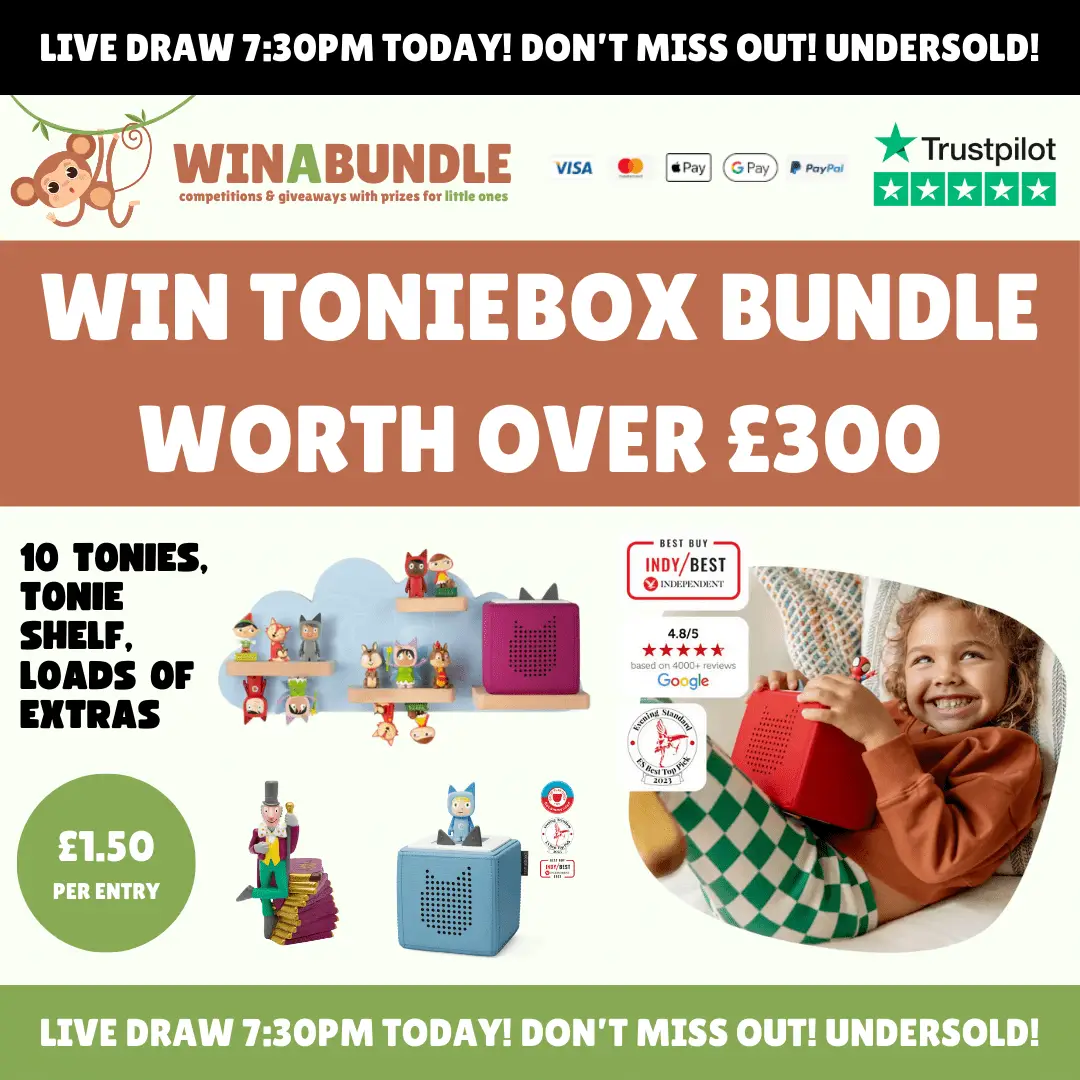 1 x Toniebox (you choose the colour), 10 x Tonies (choose from 200+), 1 x Tonie Shelf (of your choice), 1 x Tonie Foldable Headphones (you choose the colour), 1 x Toniebox USB Charger